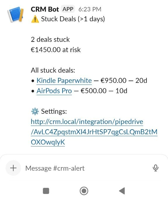 We send messages directly to your Slack. Our logic detects stuck deals, frozen money, and potential risks - so you can act faster and stop losing revenue.