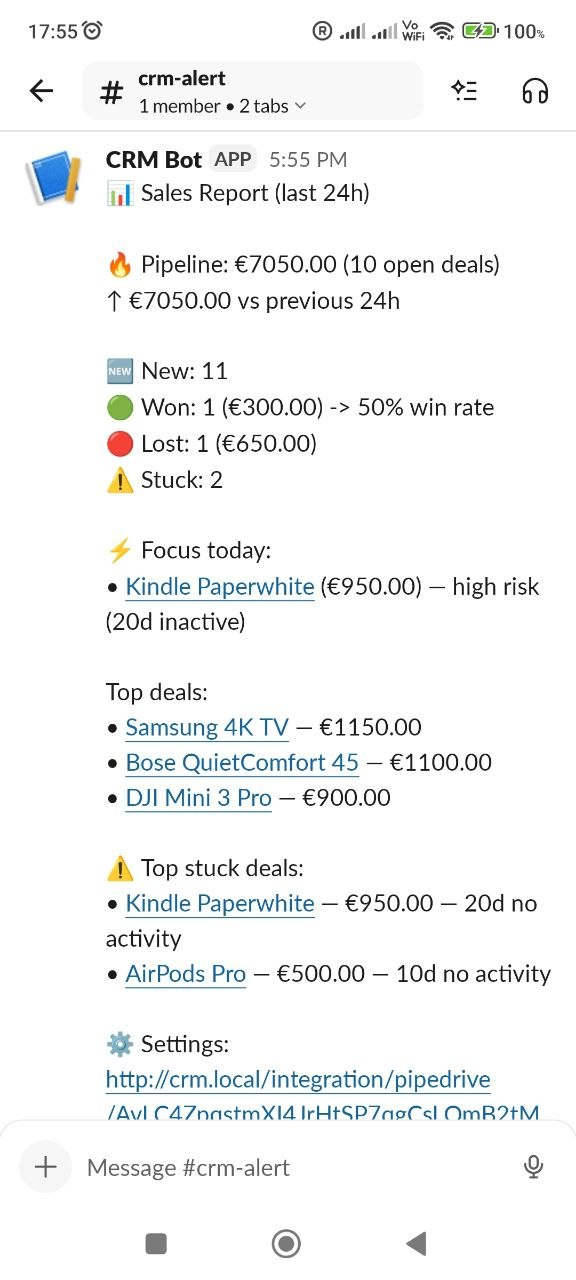 We send messages directly to your Slack. Our logic detects stuck deals, frozen money, and potential risks - so you can act faster and stop losing revenue.